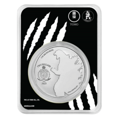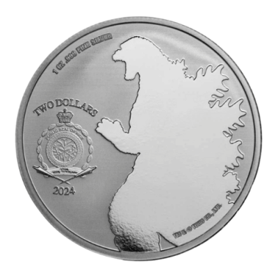 表面: そびえ立つゴジラのシルエットの横に、ニウエの紋章、額面金額、発行年が描かれています。