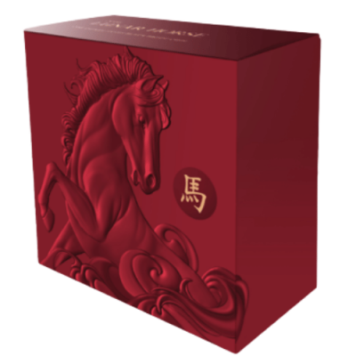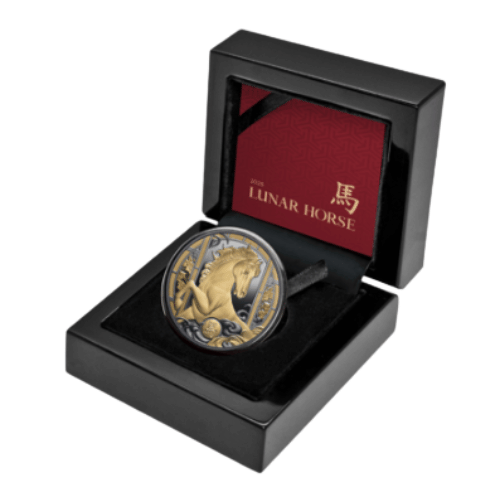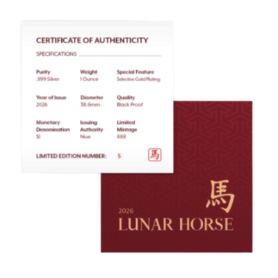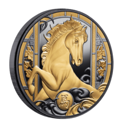 この銀貨は、干支暦で7番目の動物である2026年の午年を記念するものです。金メッキのモチーフには馬が描かれており、金色の表現がコインのブラックプルーフ仕上げと鮮やかなコントラストを生み出しています。デザインには花の要素、様式化された雲、そして漢字の「馬」の文字も含まれています。裏面にはチャールズ3世の肖像、発行年、額面、重量、純度が記されています。
