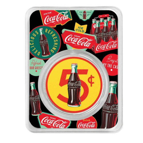 アメリカ コカ・コーラ『5セント 』 1オンス シルバーラウンド カラー ブリスターパック入