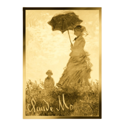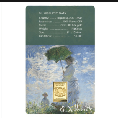 コインカードの表面には、1875年にモネが制作した有名な絵画の色鮮やかな描写が施されています。鮮やかな空を背景に、花の咲く草原に日傘を差した女性と子供が描かれており、印象派の印象的なモチーフです。側面には「クロード・モネ」の名前が様式化された文字で刻まれています。