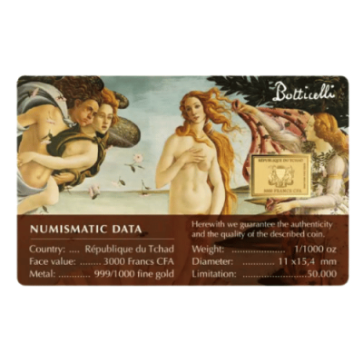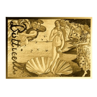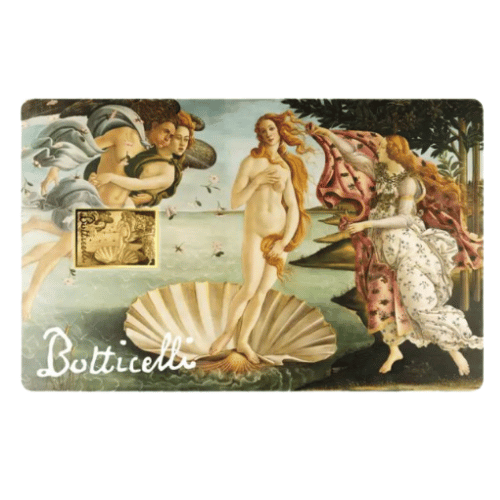 コインカードの表面には、貝殻の上に立つ優雅なヴィーナスとゼピュロス、そしてアウラを描いたボッティチェリの「ヴィーナスの誕生」の精巧な描写が施されています。対応する金貨には、この象徴的なイメージが精巧かつ巧みに表現され、ボッティチェリの署名を称えています。