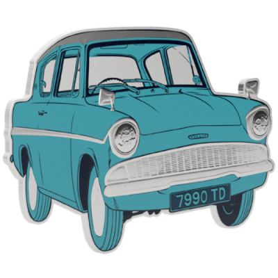 3部構成の「ハリー・ポッター - 魔法の乗り物」シリーズの第2弾として、魔法のフォード・アングリアがテーマです。コインは、この象徴的な車両のユニークな魅力を捉えるため、水色のフォード・アングリアの形と色で忠実に再現されています。映画でおなじみのナンバープレート「7990 TD」が前面に刻印されています。